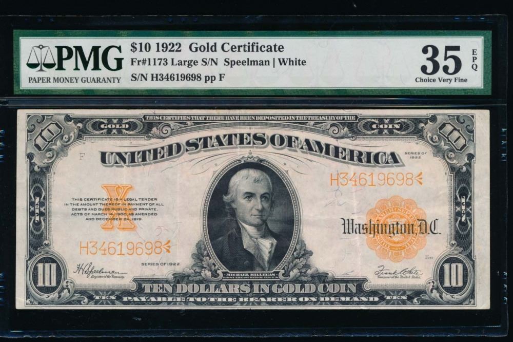 One 1922 $10 Gold Certificate PMG 35EPQ.