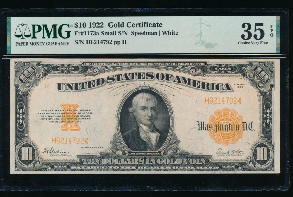 One 1922 $10 Gold Certificate PMG 35EPQ.