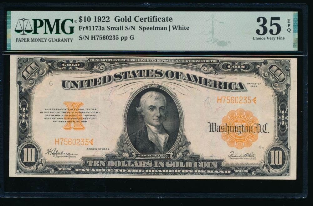 One 1922 $10 Gold Certificate PMG 35EPQ.
