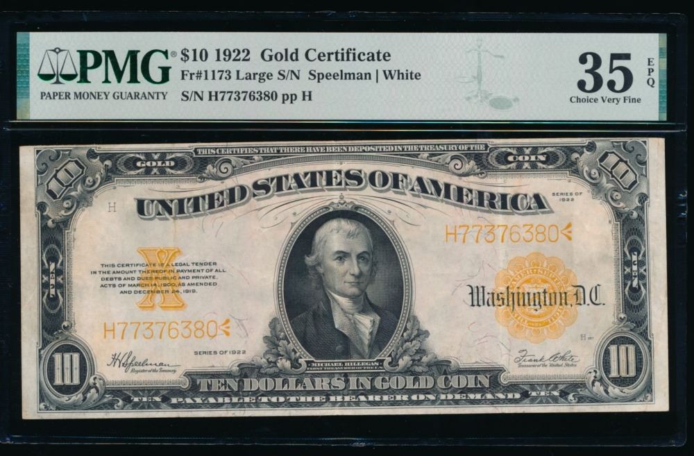 One 1922 $10 Gold Certificate PMG 35EPQ.