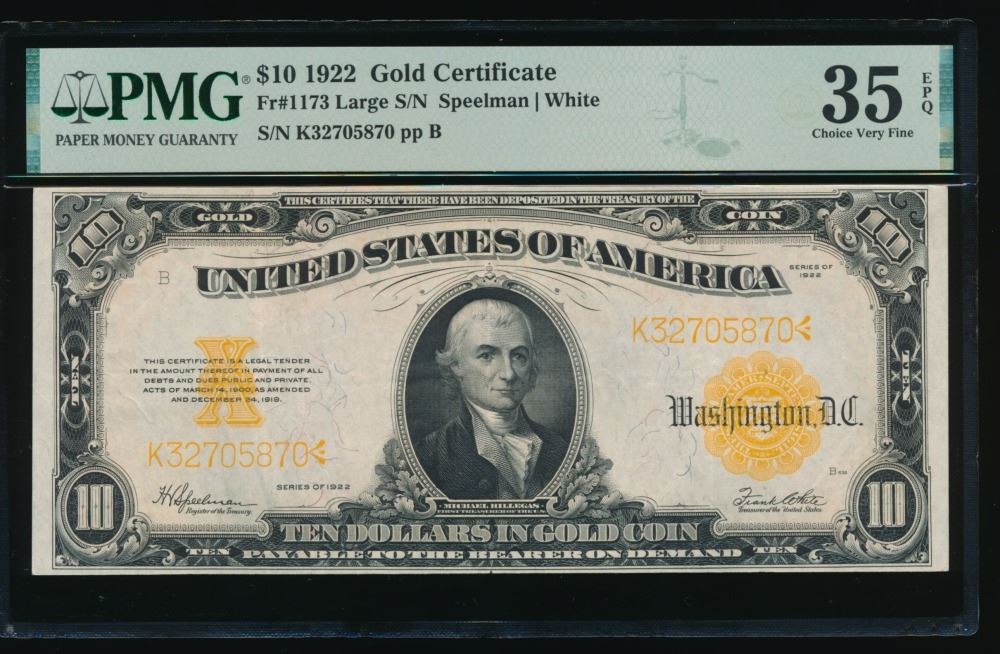 One 1922 $10 Gold Certificate PMG 35EPQ.