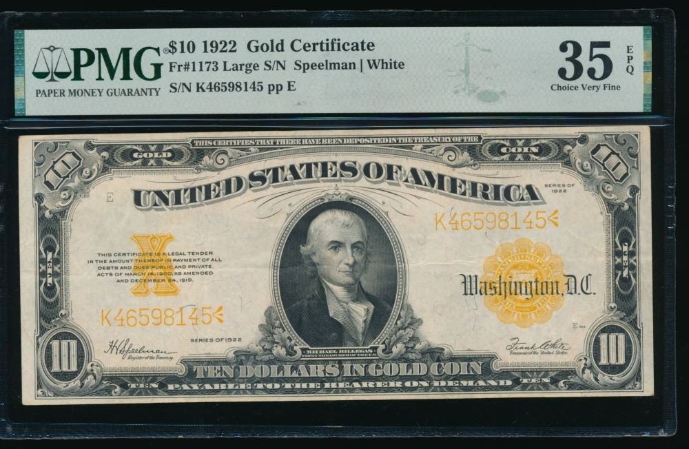 One 1922 $10 Gold Certificate PMG 35EPQ.