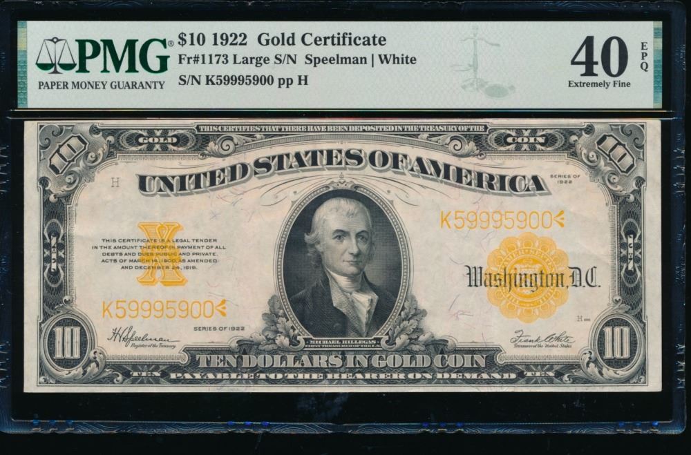 One 1922 $10 Gold Certificate PMG 40EPQ.