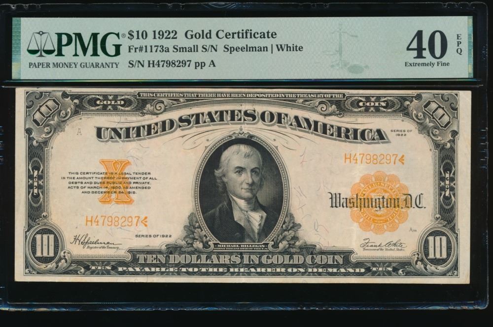 One 1922 $10 Gold Certificate PMG 40EPQ.