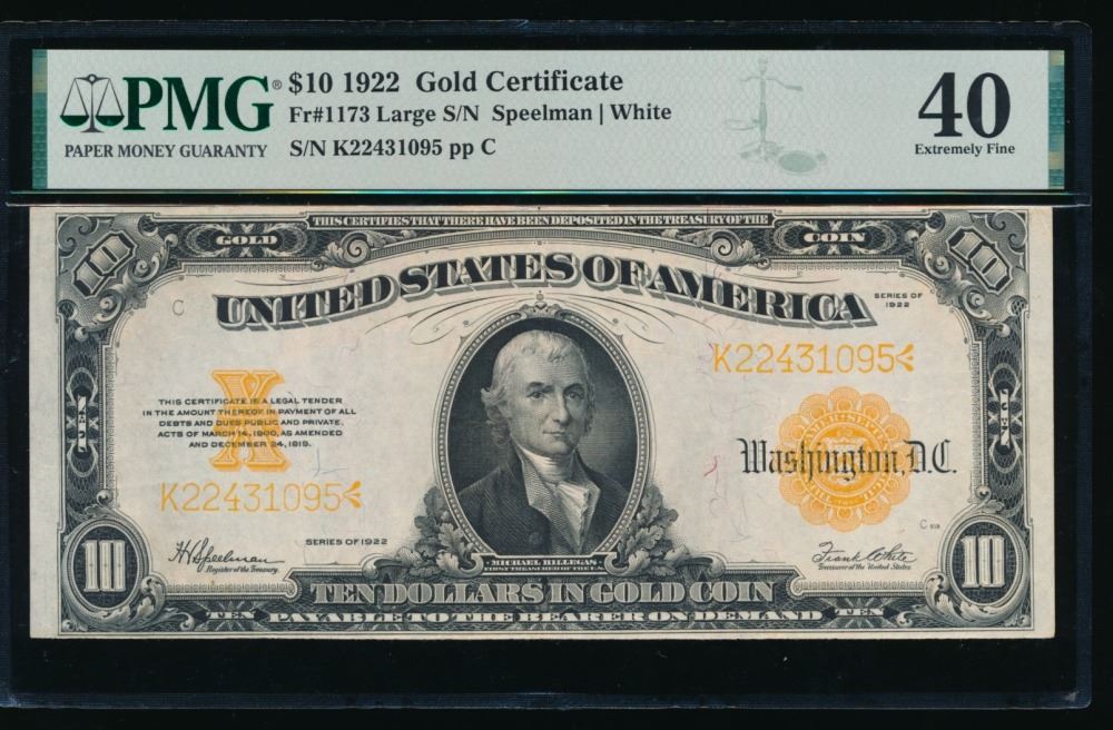 One 1922 $10 Gold Certificate PMG 40.