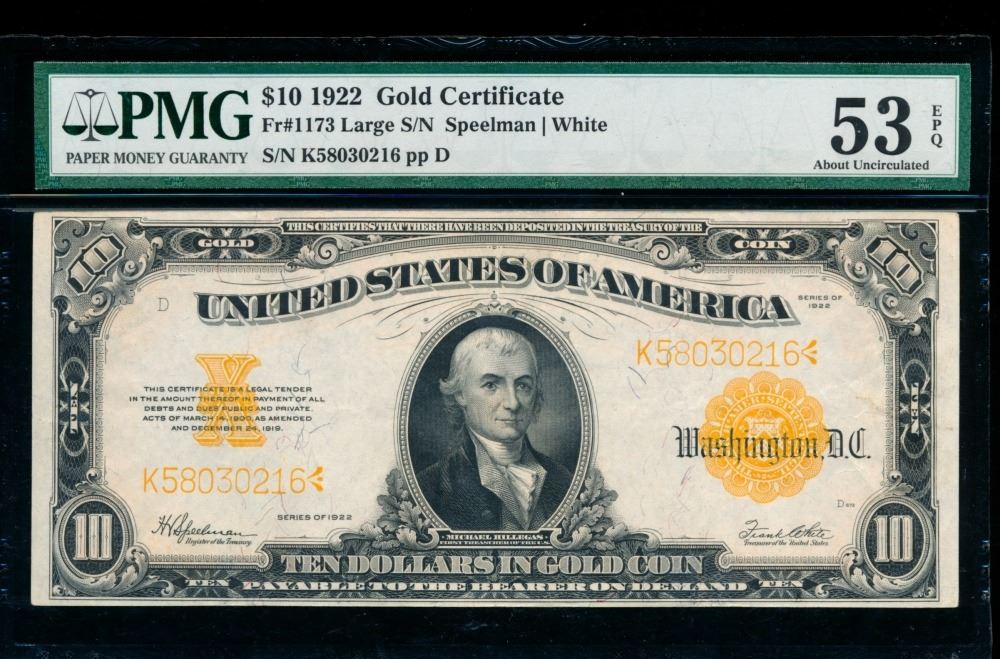 One 1922 $10 Gold Certificate PMG 53EPQ.