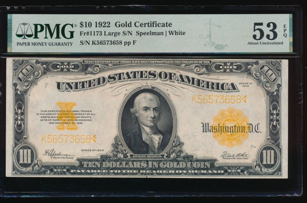 1922 $10 Gold Certificate PMG 53EPQ