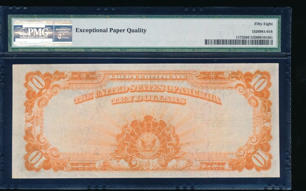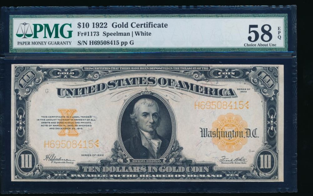 One 1922 $10 Gold Certificate PMG 58EPQ.