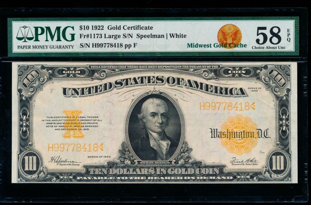 One 1922 $10 Gold Certificate PMG 58EPQ.