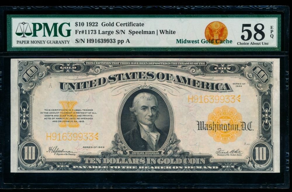 One 1922 $10 Gold Certificate PMG 58EPQ.