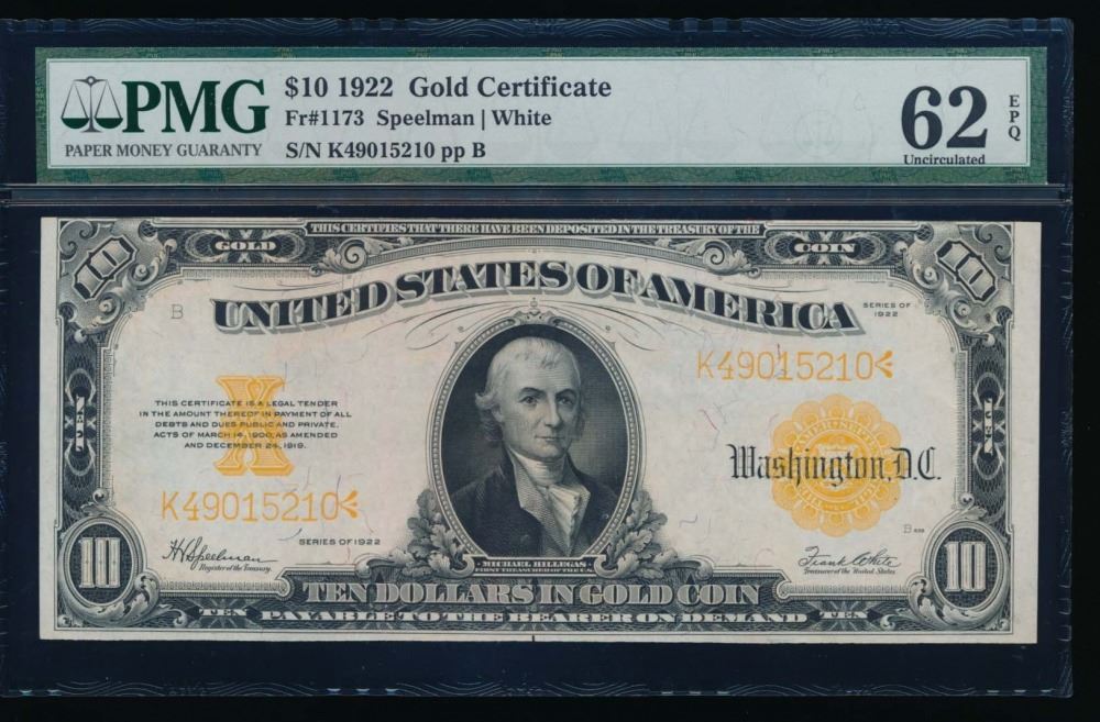 One 1922 $10 Gold Certificate PMG 62EPQ.