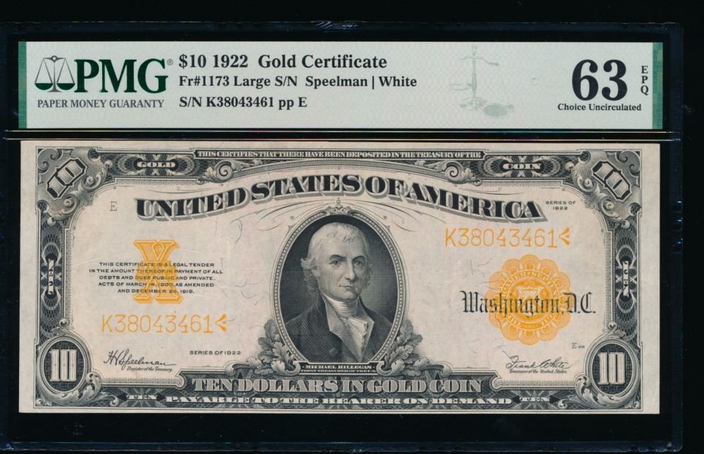 One 1922 $10 Gold Certificate PMG 63EPQ.