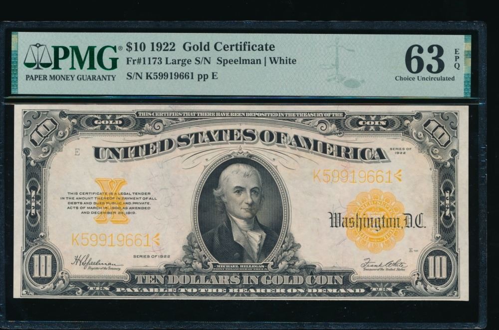 One 1922 $10 Gold Certificate PMG 63EPQ.