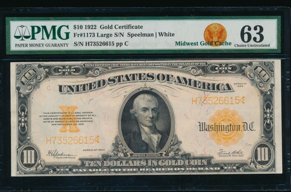 One 1922 $10 Gold Certificate PMG 63.