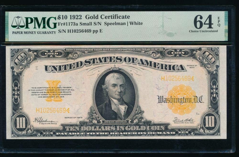 One 1922 $10 Gold Certificate PMG 64EPQ.