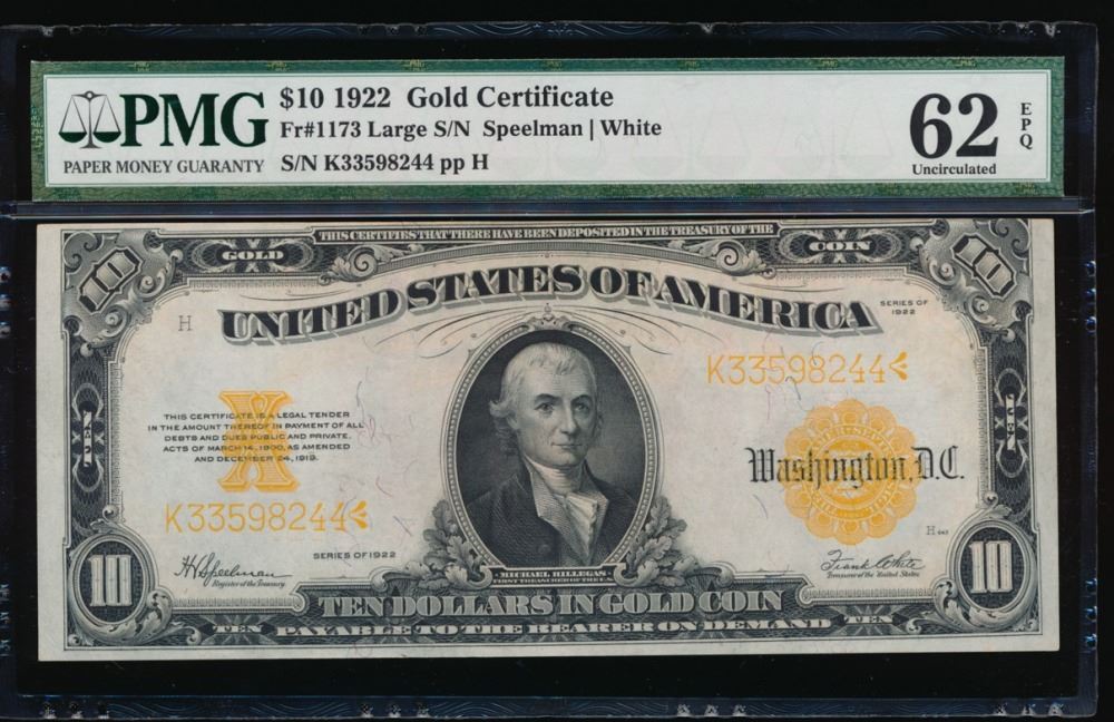 One 1922 $10 Large Gold Certificate PMG 62EPQ.