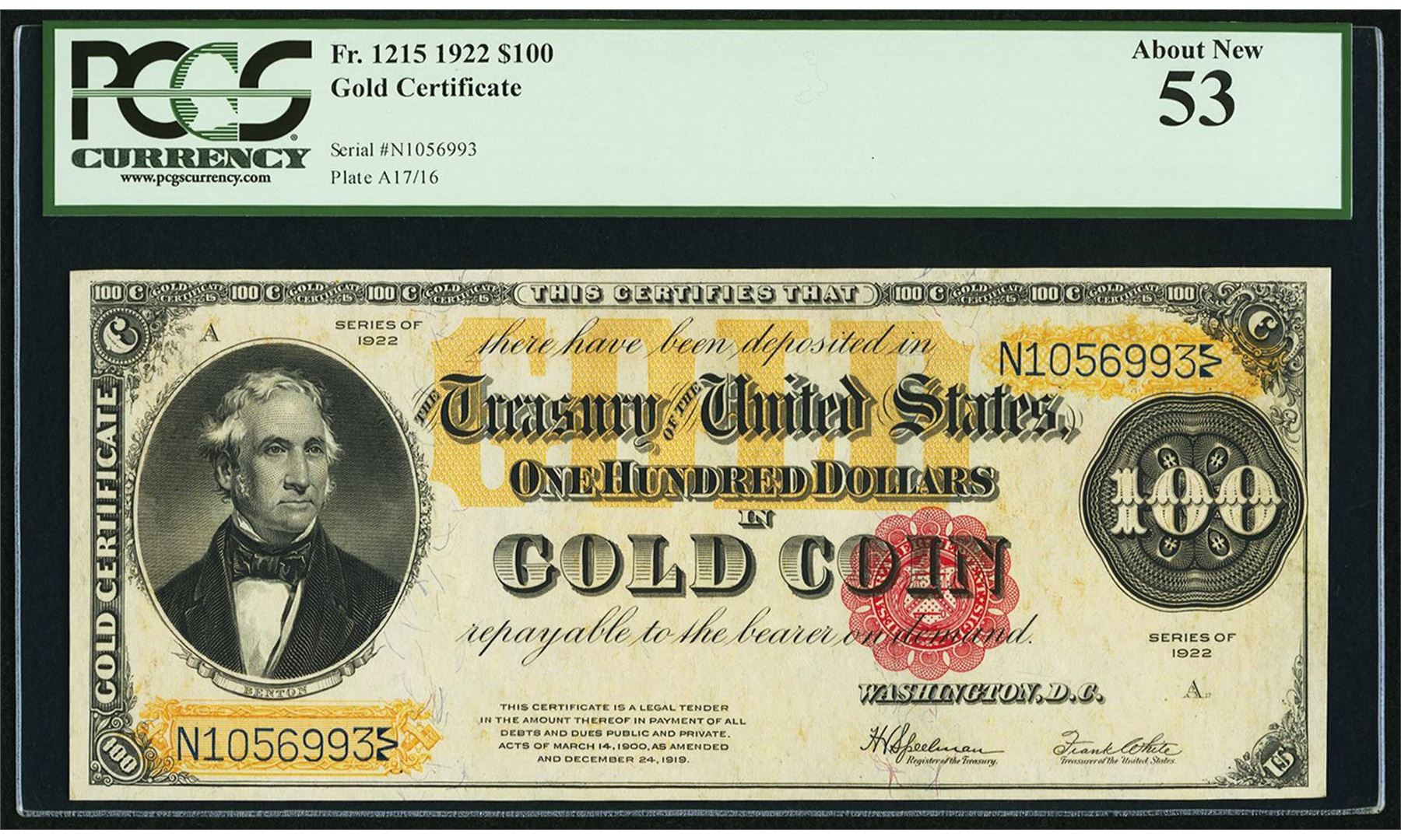 One 1922 $100 Gold Certificate Note Fr.1215 PCGS About New 53. PCGS Graded.