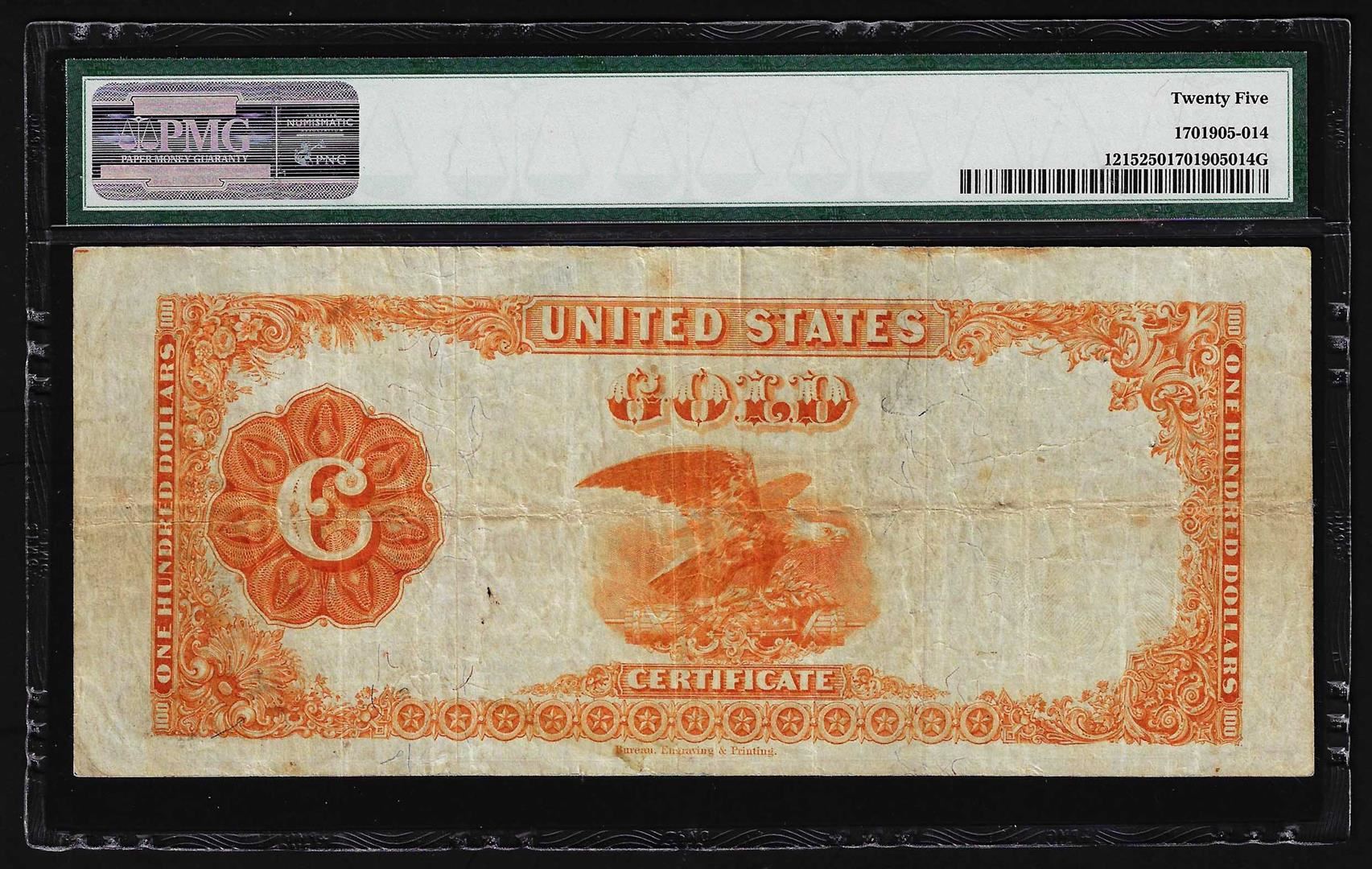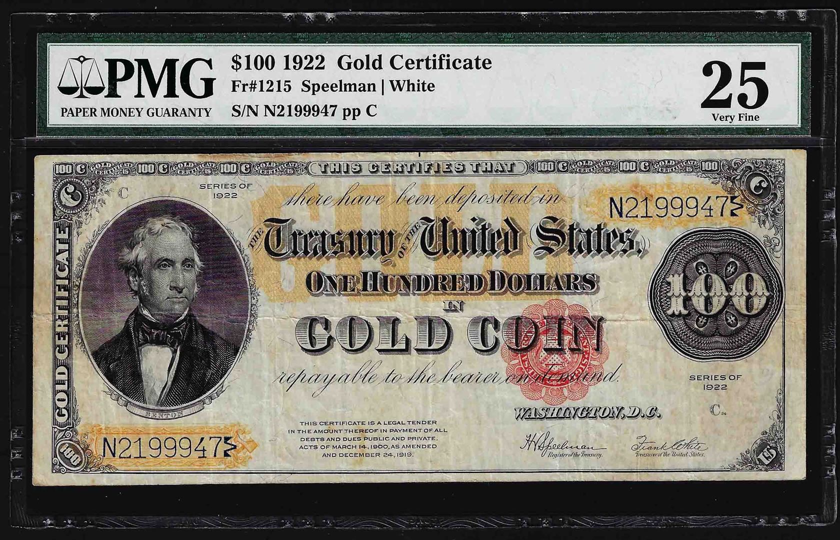 One 1922 $100 Gold Certificate Note Fr. 1215 PMG Very Fine 25. PMG Certified.