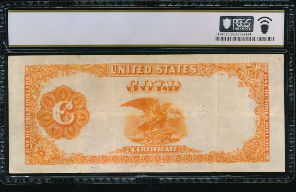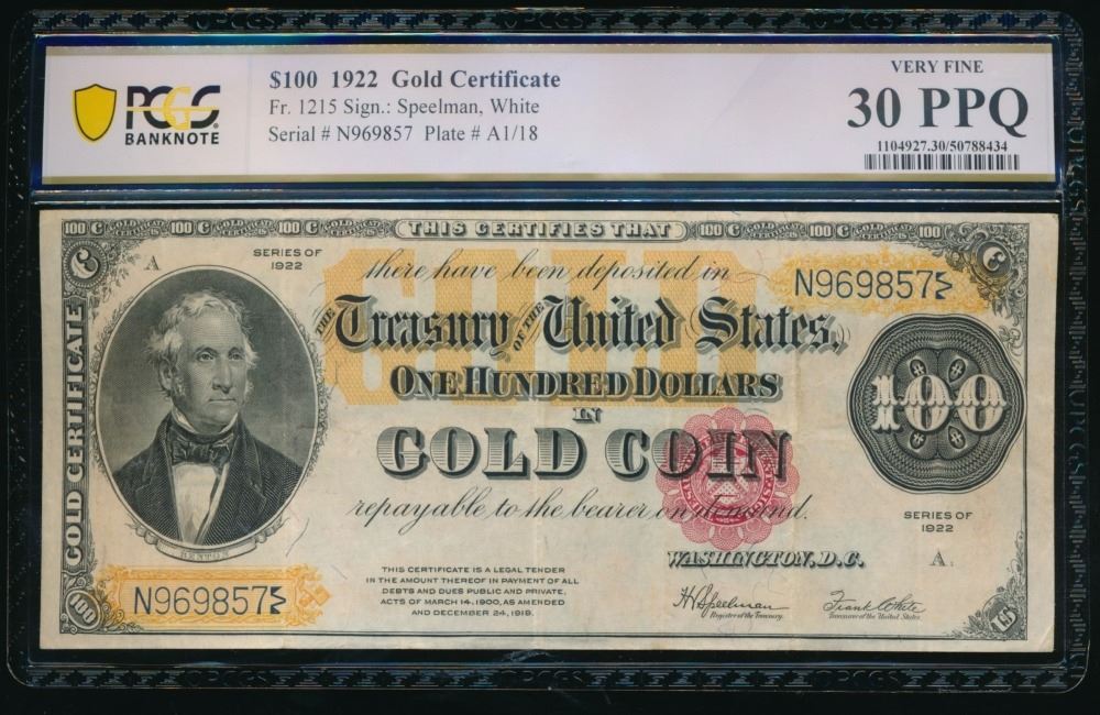 One 1922 $100 Gold Certificate PCGS 30PPQ.