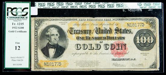 1922, $100 Gold Certificate. PCGS Fine 12. . Fr-1215. The corners are a little rounded and frayed, otherwise the paper quality is suggestive of a slightly higher grade.