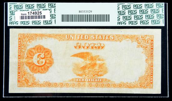 1922, $100 Gold Certificate. PCGS Very Fine 25. . Fr-1215. This Gold C-note possesses good color and eye appeal for the grade. It retains excellent crispness and the bright paper contrasts nicely with the bold inks.