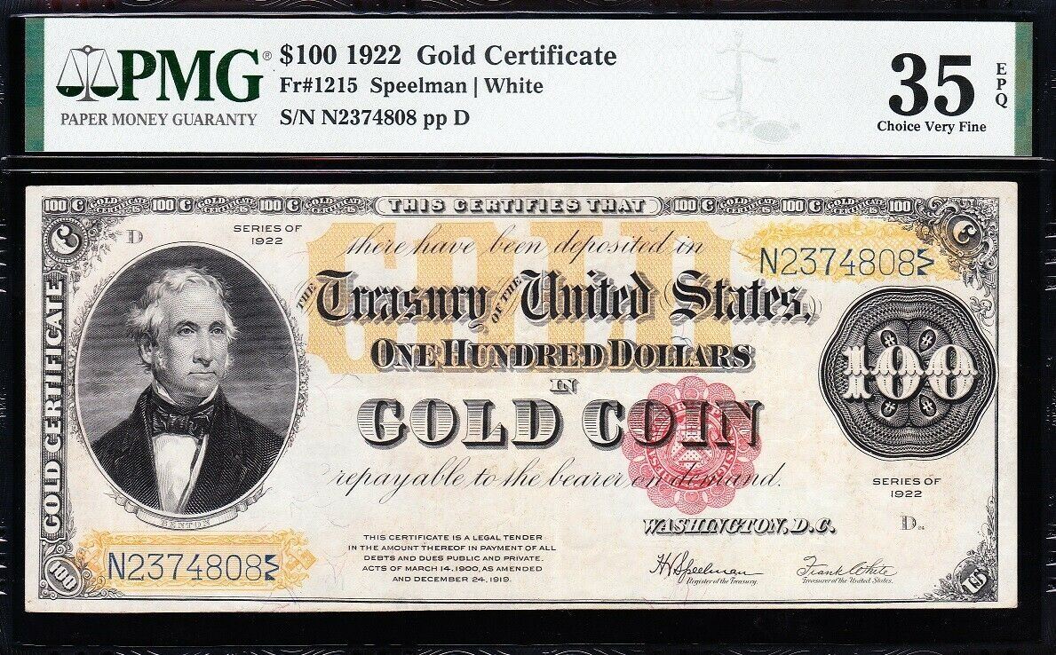One 1922 $100 Gold Certificate PMG 35EPQ.
