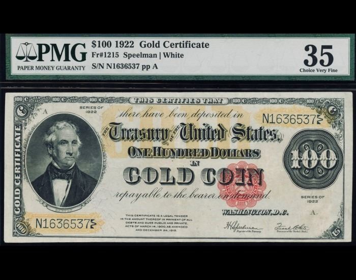 One 1922 $100 Gold Certificate PMG 35.