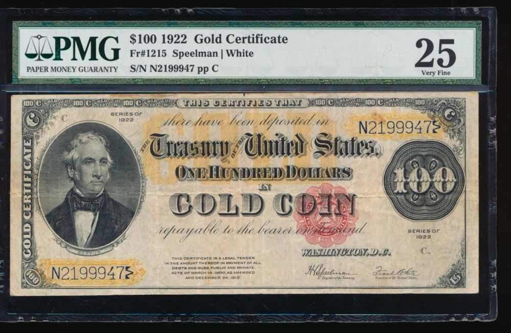 One 1922 $ 100 Large Gold Certificate PMG 25.