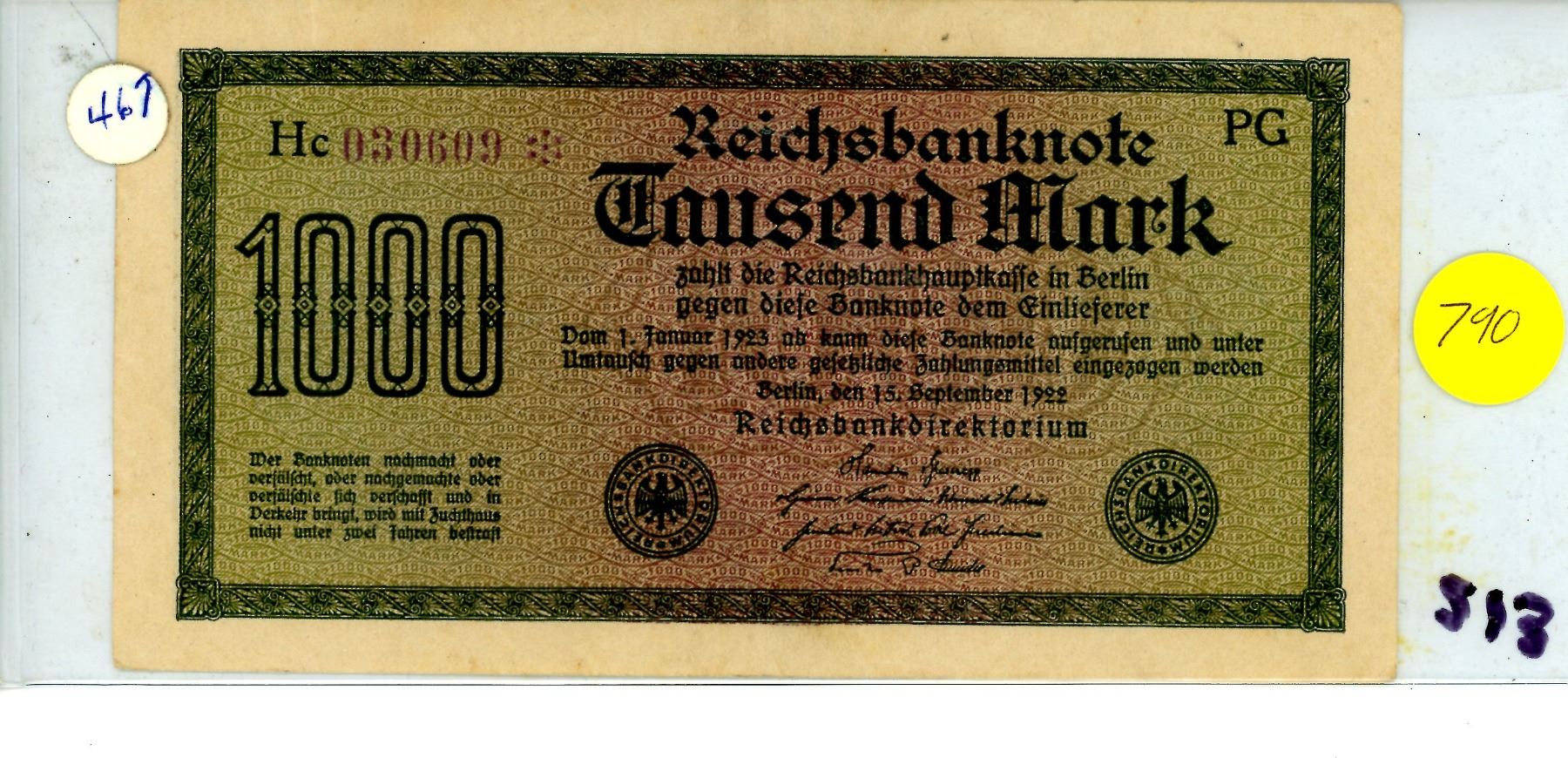 1922 1000 Mark Berlin Germany Bank Note