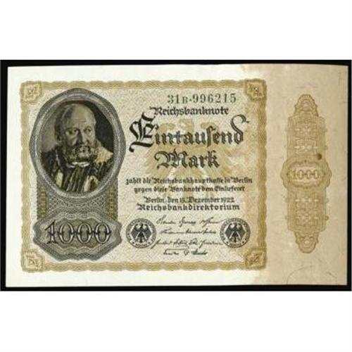 <style type="text/css"> body, td, th { font-family: Arial, Helvetica, sans-serif; font-size: 12px; color: #482424; margin: 0px; padding: 0px; } #header { background-image: url(http://www.bowersandmerena.com/ebay/images/template_v3_01.gif); clear: both; background-color: #590303; border-top-width: 2px; border-top-style: solid; border-top-color: #B38C4F; } #header #header_wrapper { height: 75px; clear: both; width: 800px; margin-right: auto; margin-left: auto; background-image: url(http://www.bowersandmerena.com/ebay/images/template_v3_03.gif); background-repeat: no-repeat; background-position: right; color: #F3EDCC; } #header #header_wrapper #header_logo { float: left; height: 75px; width: 444px; background-image: url(http://www.bowersandmerena.com/ebay/images/template_v3_02.gif); background-repeat: no-repeat; font-size: 10px; text-transform: capitalize; color: #B38C4F; } #header #header_wrapper #header_right { float: left; height: 75px; width: 356px; text-align: right; } #header #header_wrapper #header_right #headerLoginBtn { margin-bottom: 30px; } #header #header_wrapper #header_right input#txtSearch { color: #B49056; border: 1px solid #B49056; width: 175px; padding-top: 3px; padding-right: 3px; padding-bottom: 4px; padding-left: 3px; } #nav { height: 37px; background-image: url(http://www.bowersandmerena.com/ebay/images/template_v3_05.gif); clear: both; } #nav #nav_wrapper { height: 35px; width: 800px; margin-right: auto; margin-left: auto; border-left-width: 1px; border-left-style: solid; border-left-color: #B38C4F; } #nav #nav_wrapper a { padding-right: 15px; padding-left: 15px; border-right-width: 1px; border-right-style: solid; border-right-color: #B38C4F; height: 25px; padding-top: 10px; display: block; float: left; text-decoration: none; font-weight: bold; color: #5D0303; } #nav #nav_wrapper a:hover { color: #B38C4F; } #nav #nav_wrapper #search { float: right; padding-top: 7px; } #nav #nav_wrapper #search #txtSearch { font-family: Arial, Helvetica, sans-serif; font-size: 10px; text-transform: uppercase; color: #D2AE75; border: 1px solid #B38C4F; padding: 3px; } #content_bgd { background-image: url(http://www.bowersandmerena.com/ebay/images/template_v3_09.gif); background-repeat: repeat-y; background-position: center; padding-top: 15px; padding-bottom: 15px; background-color: #FBFBDB; } #content_wrapper { clear: both; height: auto; width: 800px; margin-right: auto; margin-left: auto; } .LotDetailWhite { line-height:normal; font-size:13px; font-family: arial,helvetica,sans-serif; color: White; font-weight: bold; } .LotDetailInformation { line-height:normal; font-size: 13px; font-family: arial,helvetica,sans-serif; } .LotDetailMessage { line-height:normal; font-size: 13px; font-family: arial,helvetica,sans-serif; color: red; } } tr.HeaderAuctionTitle td { color: #000000; font-weight: bold; padding: 2px; background-image: url(http://www.bowersandmerena.com/ebay/images/template_v3_05.gif); background-repeat: repeat-x; border-bottom-width: 1px; border-bottom-style: solid; border-bottom-color: #B38C4F; } table.AuctionSummary a, table.AuctionSummary a:link, table.AuctionSummary a:visited { color: #0000FF; text-decoration: none; } } td.tableHeaderLeft { border-left-width: 1px; border-left-style: solid; border-left-color: #B38C4F; } td.tableHeaderRight { border-right-width: 1px; border-right-style: solid; border-right-color: #B38C4F; } td.tableCellMiddle { border-left-width: 1px; border-left-style: solid; border-left-color: #B38C4F; border-right-width: 1px; border-right-style: solid; border-right-color: #B38C4F; padding: 5px; } tr.footer td { border-top-width: 1px; border-top-style: solid; border-top-color: #B38C4F; } </style> </head> <body> <div id="header"> <div id="header_wrapper"> <div id="header_logo"> </div> <div id="header_right"> </div> </div> </div> <div id="nav"> <div id="nav_wrapper"> <a href="http://www.bowersandmerena.com">Our eBayLive Auctions</a> <a href="#PaymentInfo">Payment Information</a> <a href="#ShippingInfo">Shipping Information</a> <a href="#About">About Bowers and Merena</a> </div> </div> <div id="content_bgd"> <div id="content_wrapper"> <table width="100%" border="0" cellpadding="5" cellspacing="0" class="AuctionSummary"> <tbody> <tr class="HeaderAuctionTitle" style="height: 25px;"> <td align="left" class="tableHeaderLeft" > </td> <td align="center" class="tableHeaderRight"> <span style="font-size: large;">Lot #2754. Germany. 1922 1000 Mark. Republic Treasury Note. Fifth Issue. Unc.</span> </td> </tr> <tr> <td colspan="3" class="tableCellMiddle"> P-82a. This note is the lone denomination for the fifth issue 1922 notes and was never issued for circulation as the inflation rate was so drastic the denomination became to an extent useless. This note however bears a lovely portrait of Mint master J. Herz at the upper left and the lovely brown tinted paper at the left is a nice complement to the rest of the design. The serial number on this example is 4 mm which makes it the "a" variety which is more readily seen than the serial numbers which are 4.5 mm or taller. A great Uncirculated note loaded with technical quality.