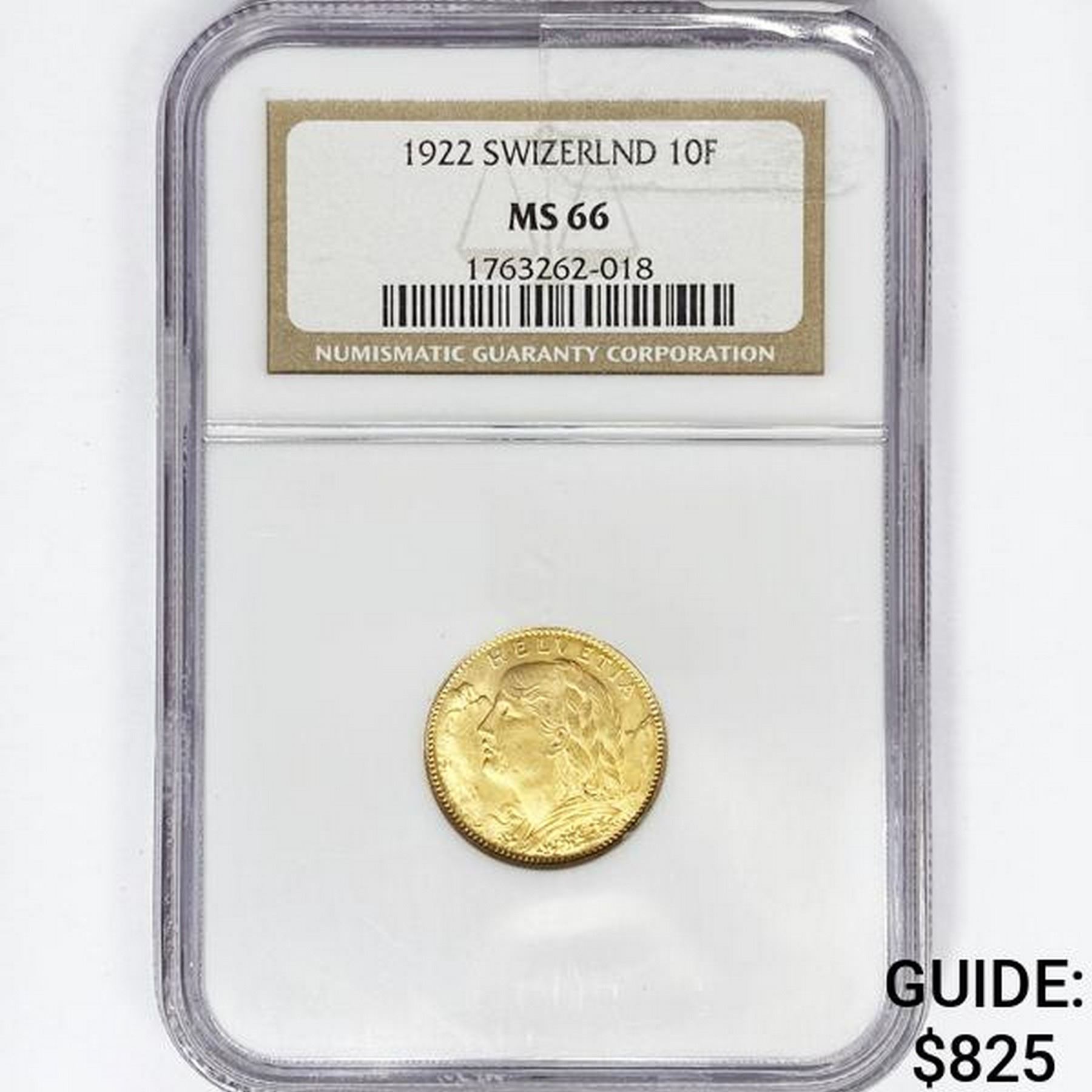 1922 10F .093oz gold Swizerlnd NGC MS66