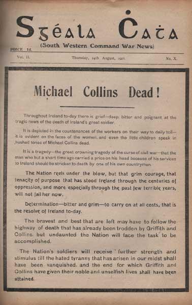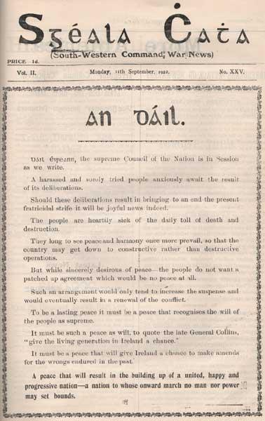 Issued by Pro Government forces in Limerick. The first issue, published from the County Courthouse in Limerick is a single sheet printed one side, the following 9 issues are single sheet printed both sides and four pages thereafter. Vol. II No. 1, announcing the death of President Arthur Griffith, is a larger size - 11 by 8.5 inches - and succeeding issues are larger again - 14.5 by 10 inches.Content covers the occupation of buildings - including the New Barracks - in Limerick by the anti-Treaty forces, "The Irregulars" and the fighting in the city and county as well as national events. From Vol. II No. 5 the paper changes its name to Sgéala Catha (South Western Command War News). There is extensive coverage of the death of Michael Collins and his funeral, including some photographs.