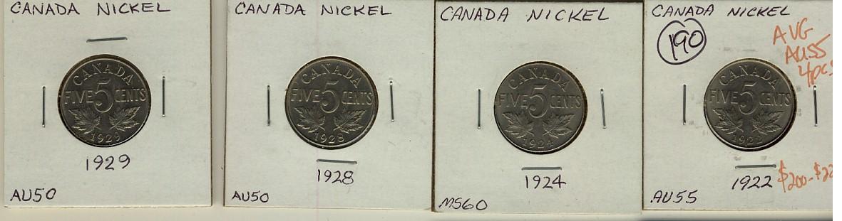 1922, 1924, 1928, 1929 5¢, average grades AU55, 4 pieces.