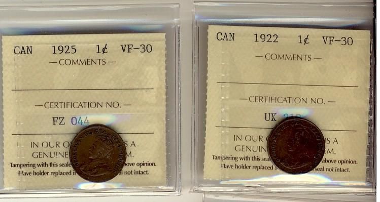1922 & 1925 1¢ ICCS VF30. Lot of 2 key date small cents.