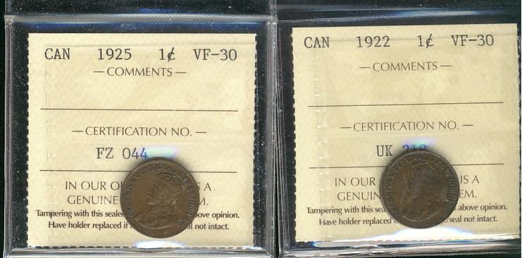 1922 & 1925 1¢ ICCS VF30. Lot of 2 key date small cents.