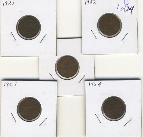 5 George V small cents; 1 each key & semi-key date. 1922-aGood, pitted; 1923-VG with light digs in the neck; 1924-VG rubbed; 1925-aVG, scratches; and 1926-Good+ with some cuts on the obverse (no return).