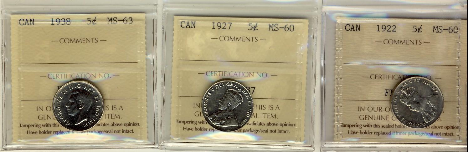 1922, 1927 5¢ ICCS MS60 & 1938 MS63. Lot of 3 coins.