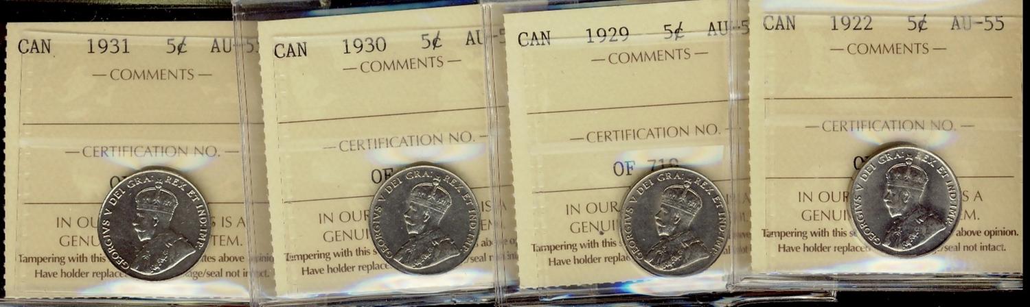 1922, 1929, 1930, 1931 5¢ all ICCS AU55, Lot of 4 coins,