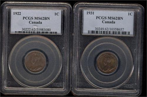 1922, 1931 both coins are PCGS graded MS62 brown, two nice lustrous brown key dates with some red lustre.