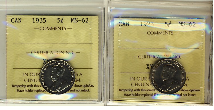 1922 & 1935 5¢ ICCS MS62. Lot of 2 coins.