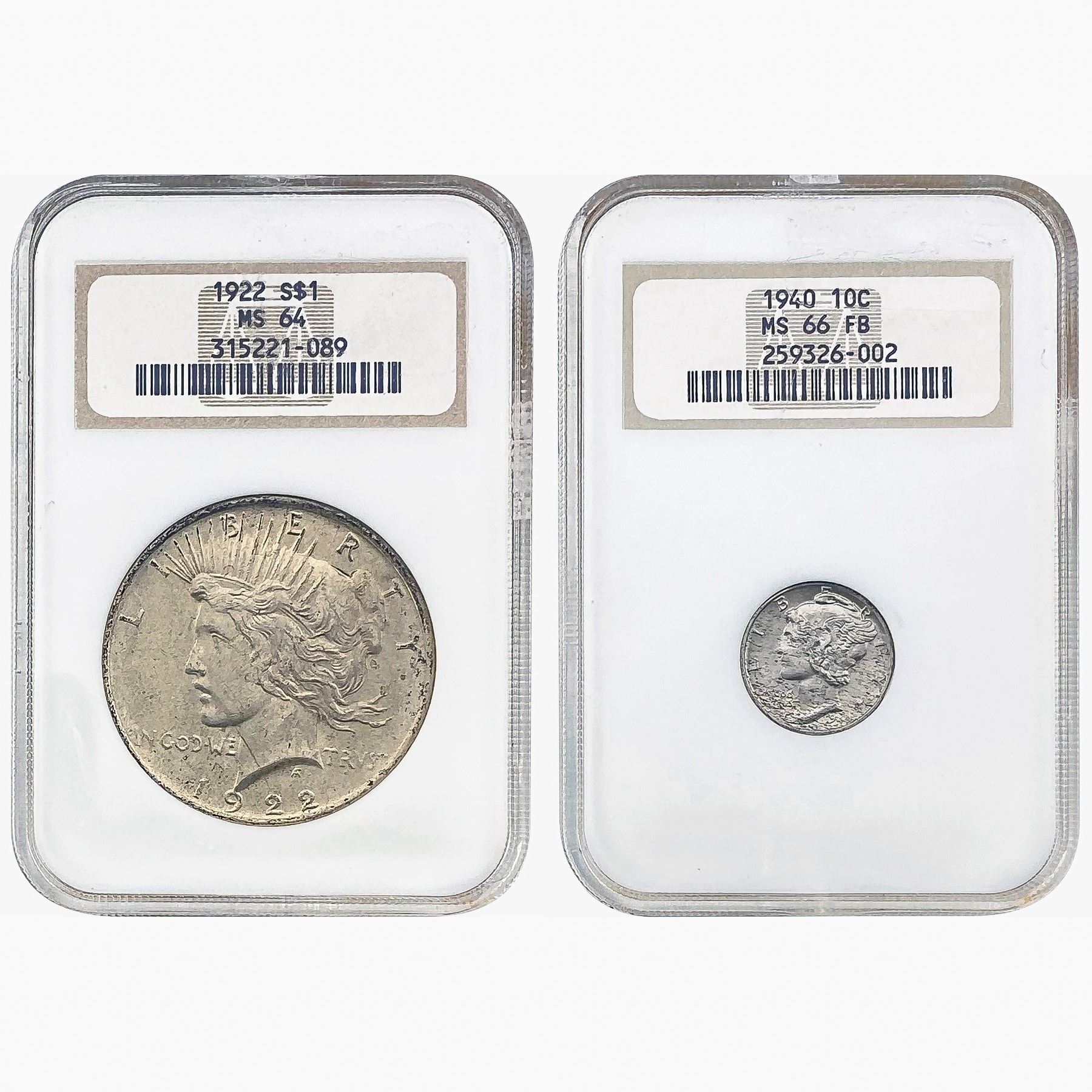 1922, 1940 Peace Dollar and Mercury Dime Lot; Old Holders NGC MS64/66