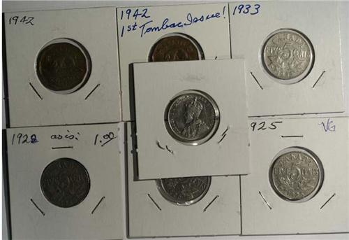 7 piece group: 1x1922-aVF with lustre; 1x 1925-VG, one of the key dates in the series; 1x1926 N6-aFine with a couple of marks; 1x1928-VG with some glue residue; 1x1933-VG; and 2x 1942 Tombacs, one piece VG with scra