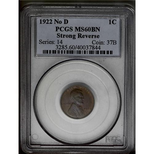 <B>1922<1C> No D Strong Reverse MS60 Brown PCGS.</B></I> Die Pair 2. The consensus among our cataloging staff confirms the quality of this important Lincoln cent. Both sides have light olive-brown surfaces with hints of blue and lilac toning. Lighter tan has faded from original mint red. This example features the strong reverse and is known as "Die Pair 2," the only variety that is recognized by PCGS to be a real 1922 No D Cent.<BR> This variety is the result of die refinishing after a clashing accident, much like the 1937-D 3-Legged Buffalo. David Lange described the process in <I>The Complete Guide to Lincoln Cents:</B></I> "The no-D variety of Die Pair 2 resulted when normal dies clashed, leaving both dies with shallow and inverted impressions of one another. The obverse die was then abrasively polished to remove these clash marks, leaving it without a mintmark and with several low-relief elements (including the date) noticeably weakened. The reverse die, however, was removed altogether and replaced with a fresh one."<BR><I>From The New York Eye Appeal Collection.</B></I>