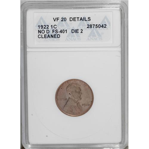 1922 1C No D, Strong Reverse--Cleaned--ANACS. VF20 Det