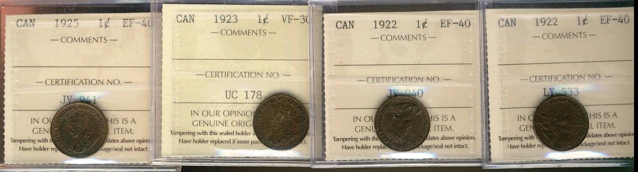 1922(2), 1925 1¢ EF40 & 1922 VF30. Lot of 4 ICCS coins.