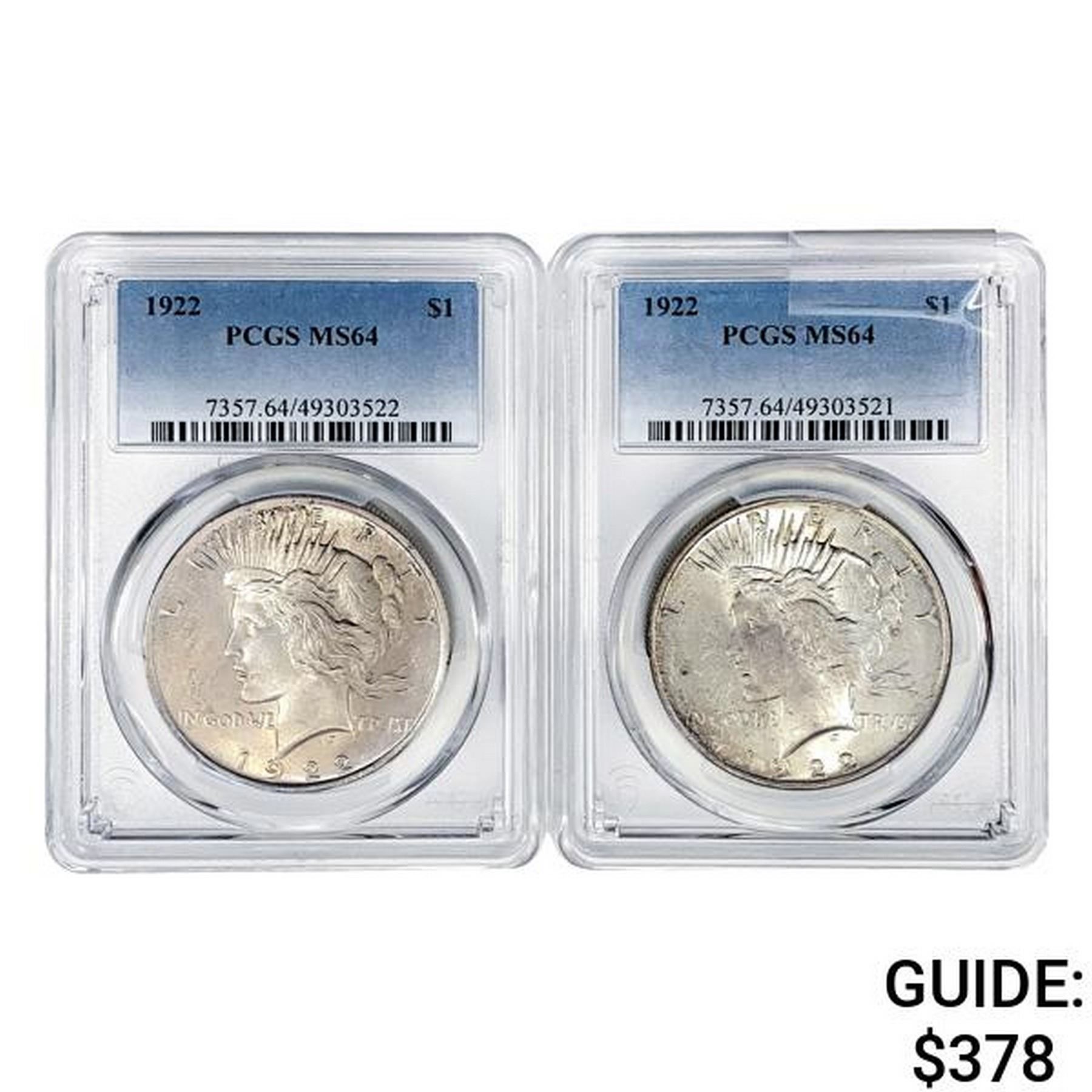 1922 [2] Silver Peace Dollar PCGS MS64