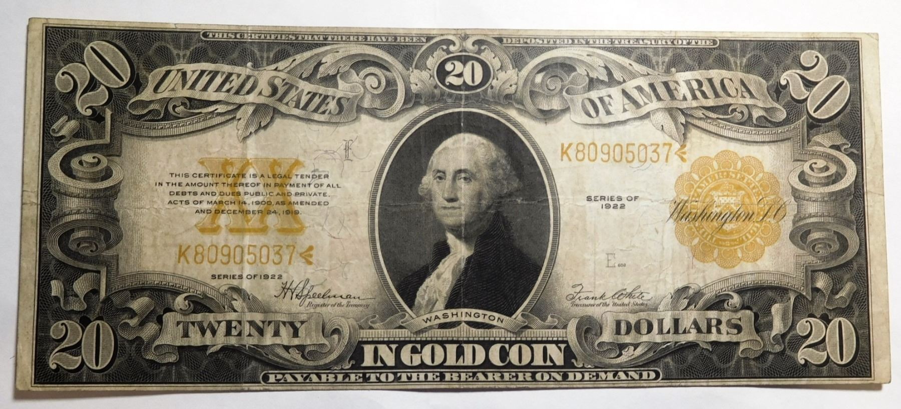 1922 $20.00 GOLD CERTIFICATE VF/XF