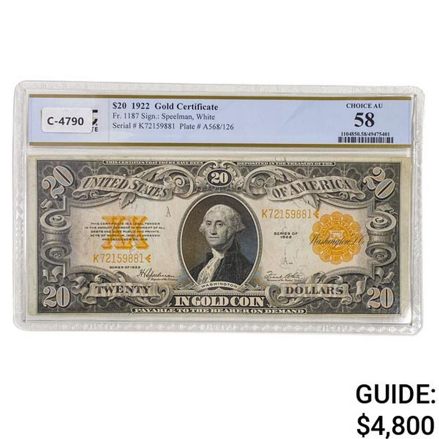 1922 $20 GOLD CERTIFICATE PCGS ABOUT UNC-58