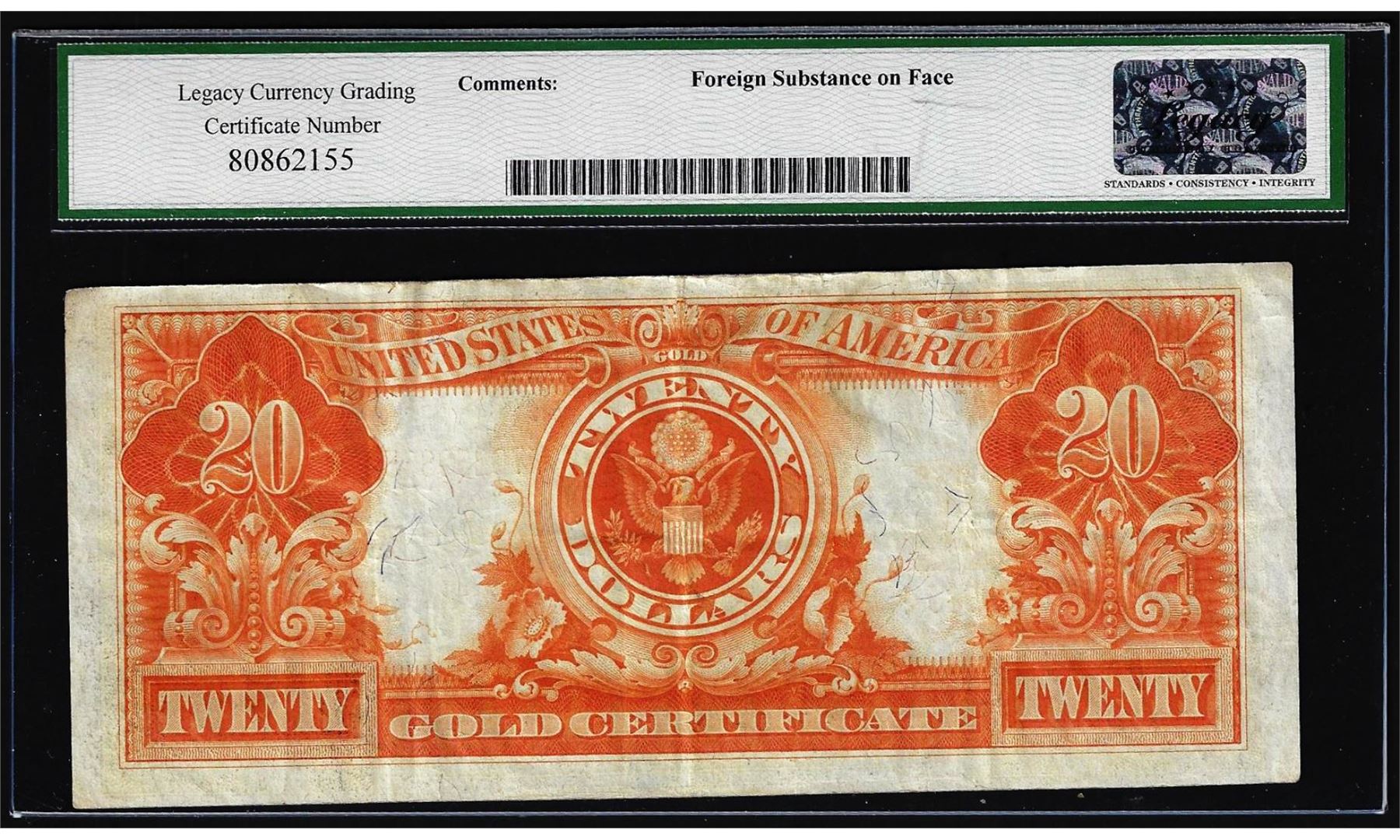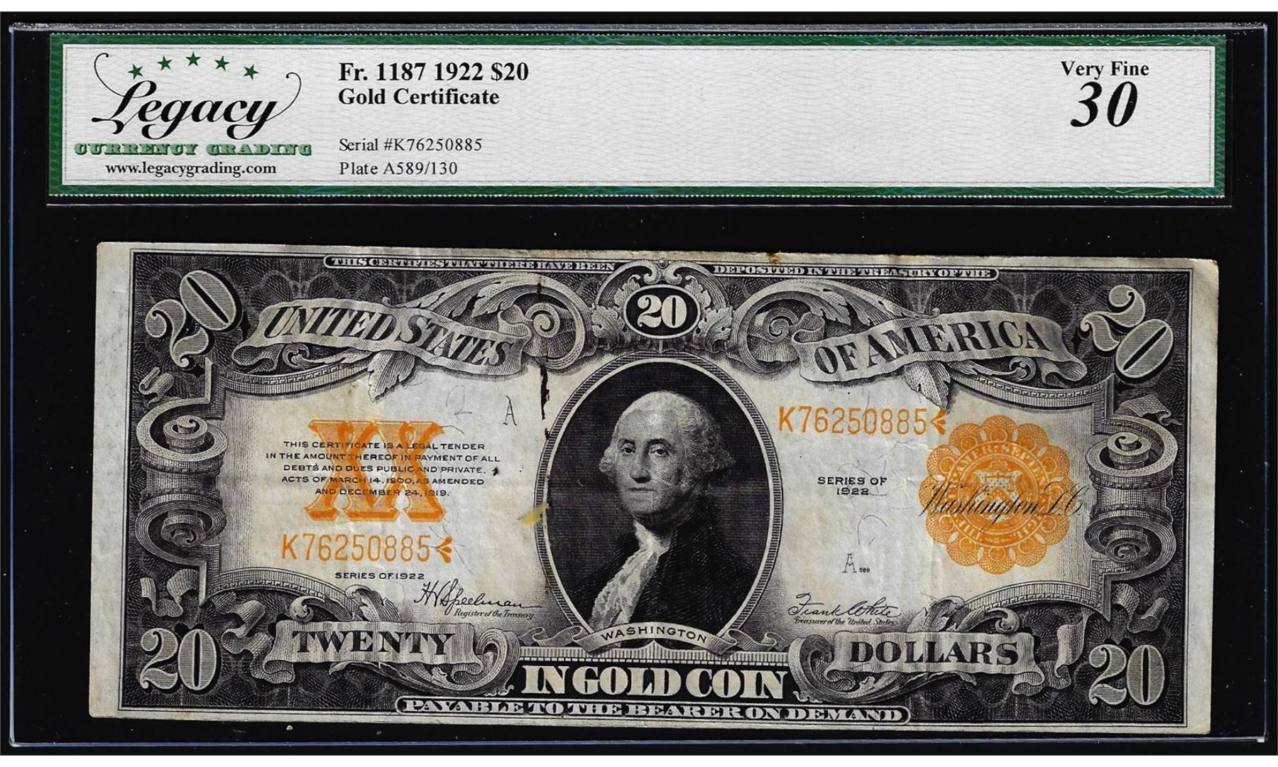 One 1922 $20 Gold Certificate Note Fr.1187 Legacy Very Fine 30. Legacy Graded.