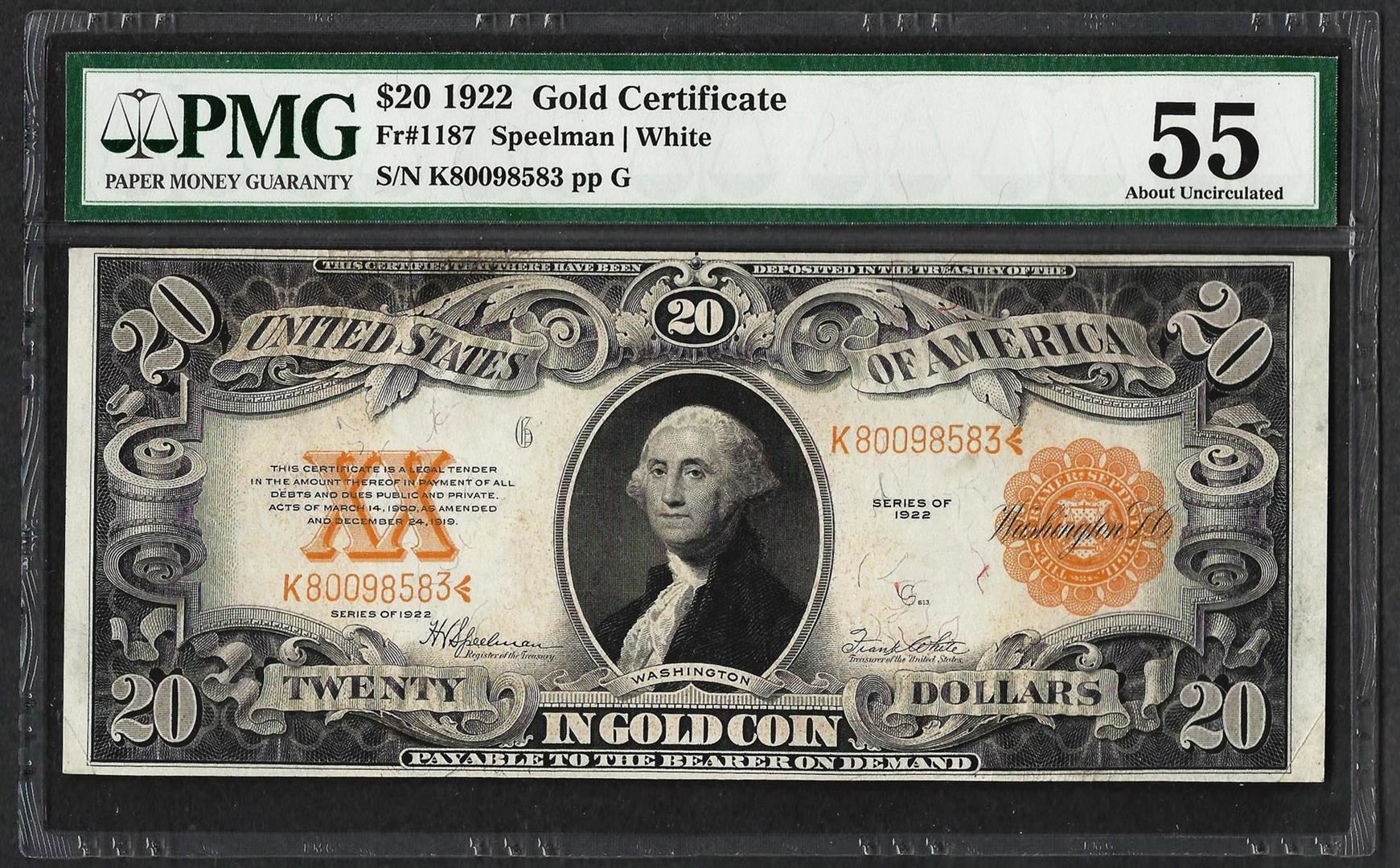 One 1922 $20 Gold Certificate Note Fr.1187 PMG About Uncirculated 55. PMG Certified.